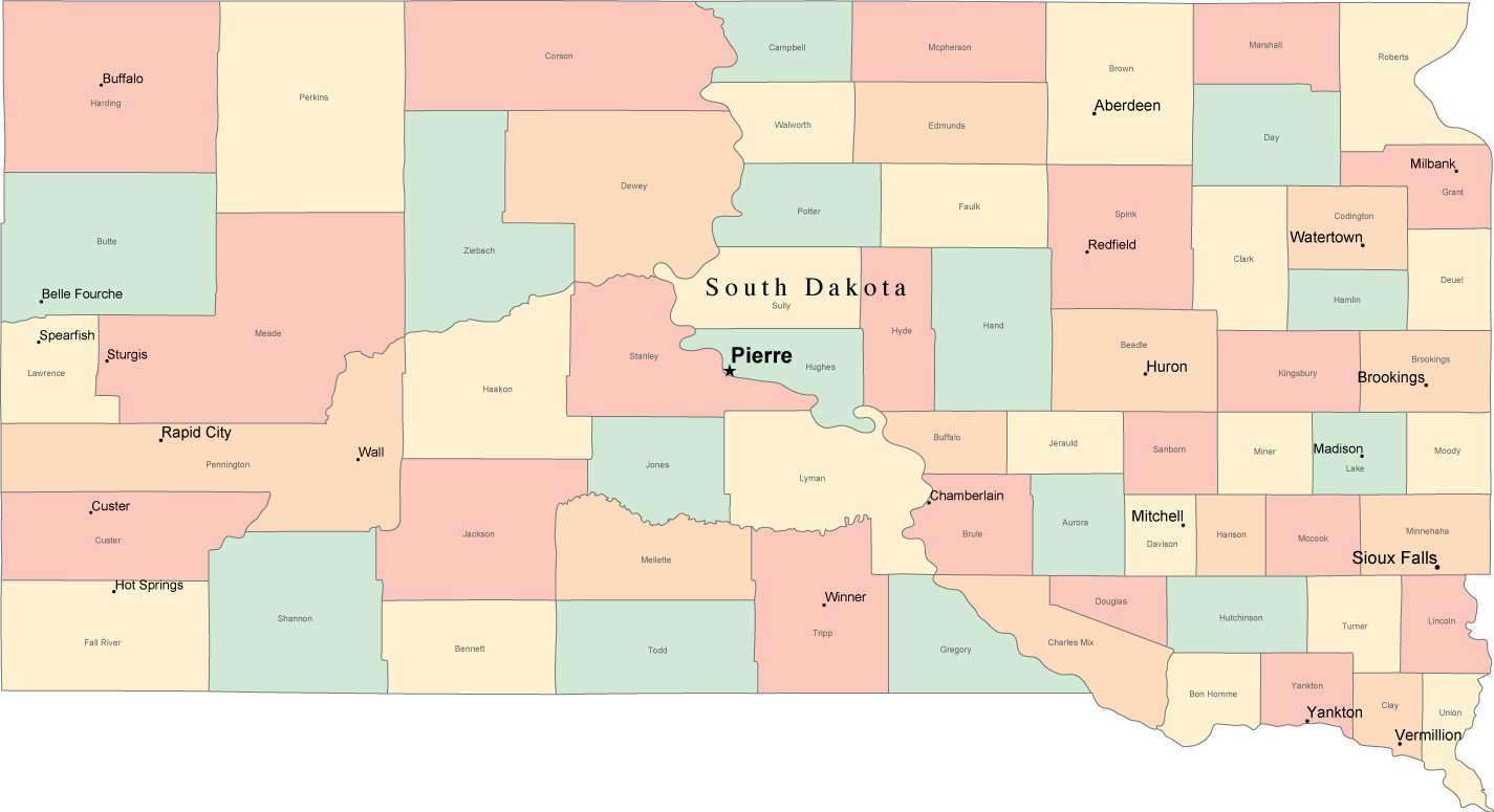 Multi Color South Dakota Map with Counties, Capitals, and Major